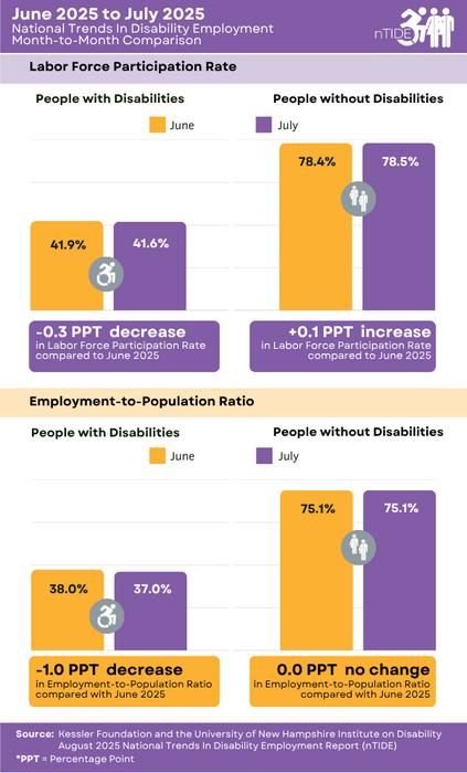 Basierend auf den Daten des heute veröffentlichten Beschäftigungsberichts des US Bureau of Labor Statistics (BLS) sank die Beschäftigungsquote für Menschen mit Behinderungen (16–64 Jahre) von 38,0 Prozent im Juni 2025 auf 37,0 Prozent im Juli 2025 (minus 2,6 Prozent bzw. 1 Prozentpunkt). Für Menschen ohne Behinderungen (16–64 Jahre) blieb die Beschäftigungsquote im Juni 2025 und Juli 2025 unverändert bei 75,1 Prozent. Die Beschäftigungsquote, ein wichtiger Indikator, gibt den Prozentsatz der arbeitenden Menschen im Verhältnis zur Gesamtbevölkerung an (die Zahl der arbeitenden Menschen geteilt durch die Zahl der Menschen in der Gesamtbevölkerung multipliziert mit 100).